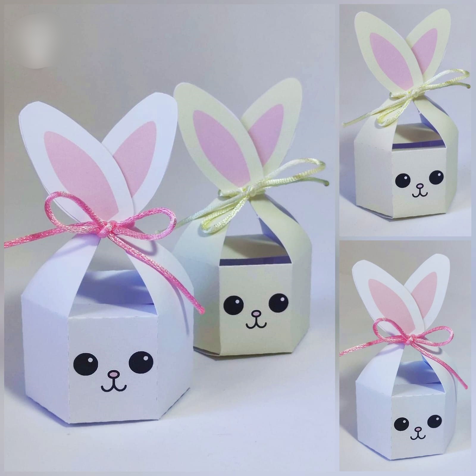 Caixinha hexagonal com orelhinhas de coelho e lacinho decorativo — o modelo mais delicado e elegante da coleção de Páscoa. Perfeita para presentear com chocolates ou guloseimas.